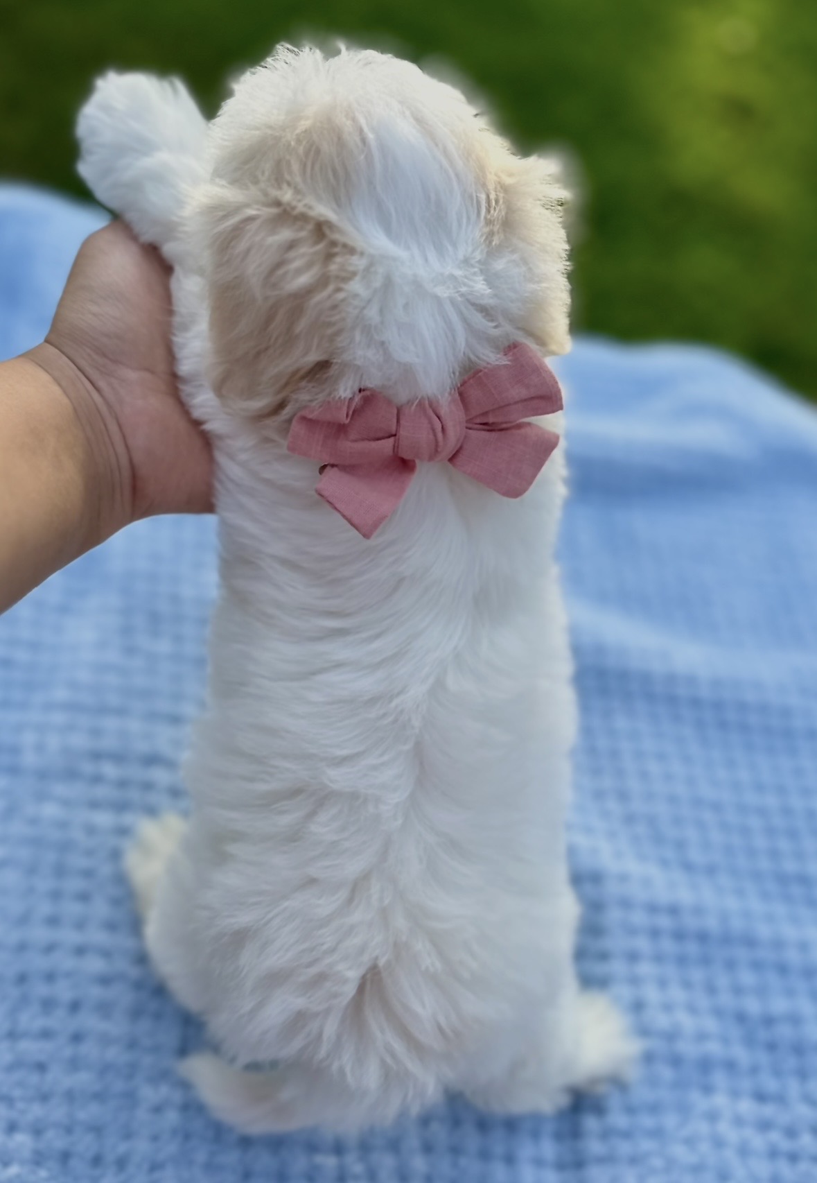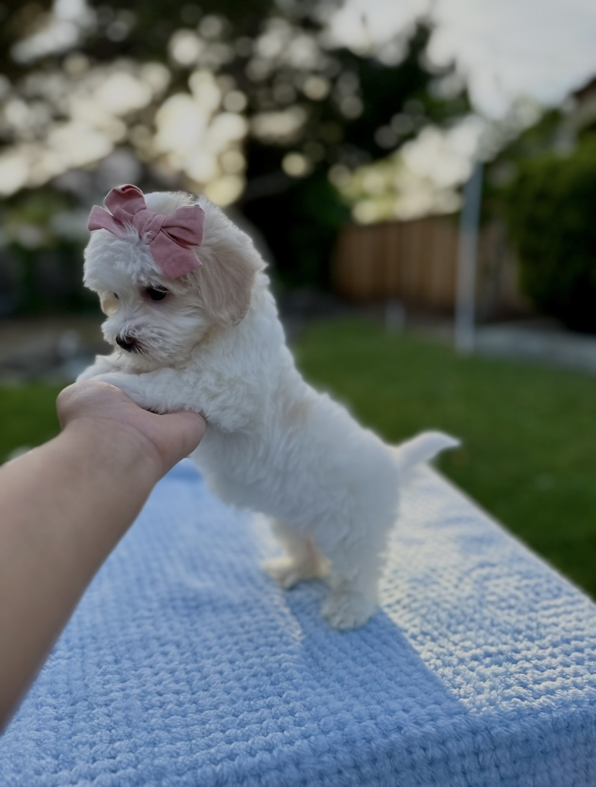 - Pearl is a female Maltipoo puppy with a gorgeous, soft, white coat and adorable light apricot ears